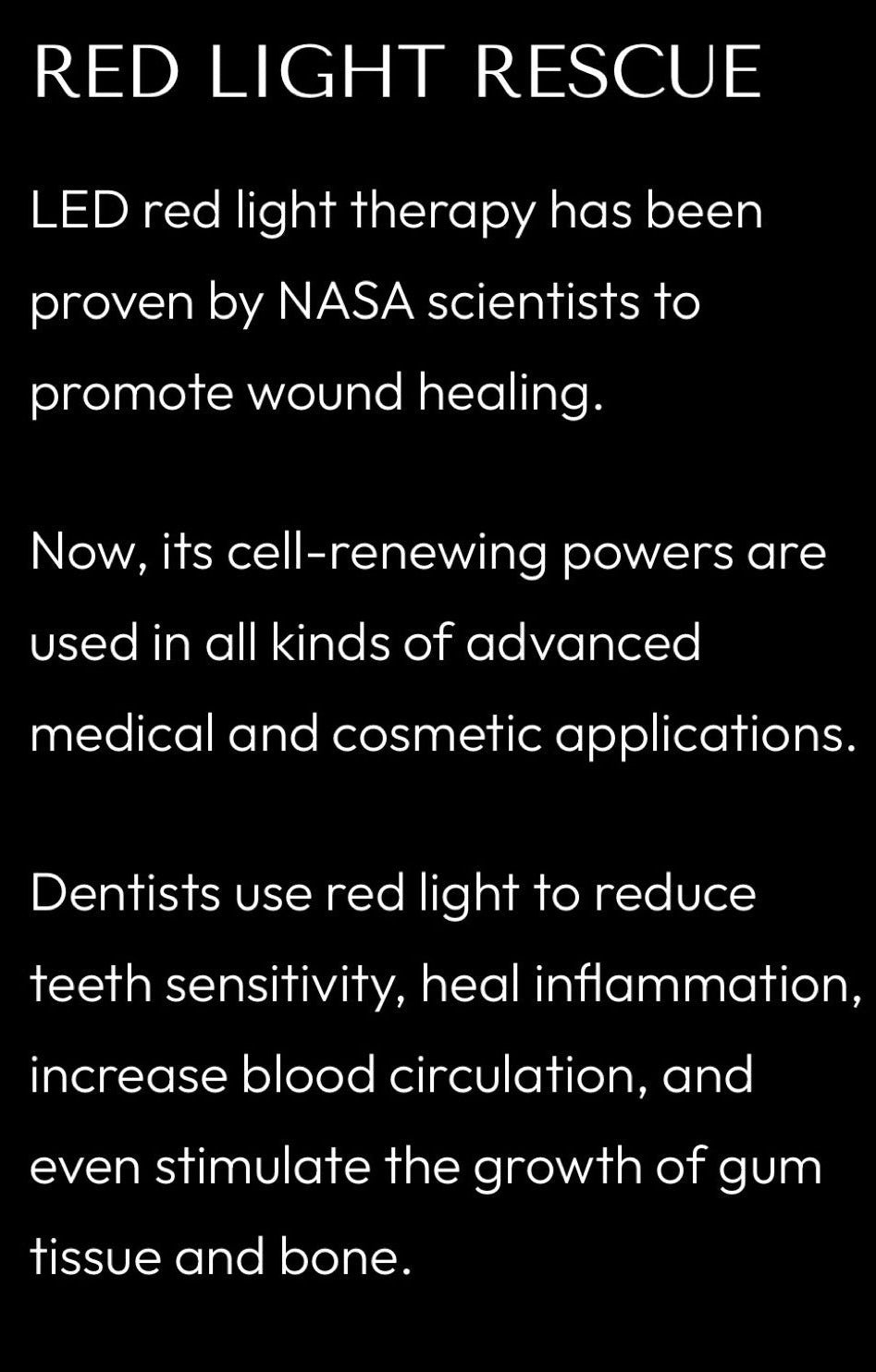 - Red light reduces gum inflammation, promotes healing and eases pain